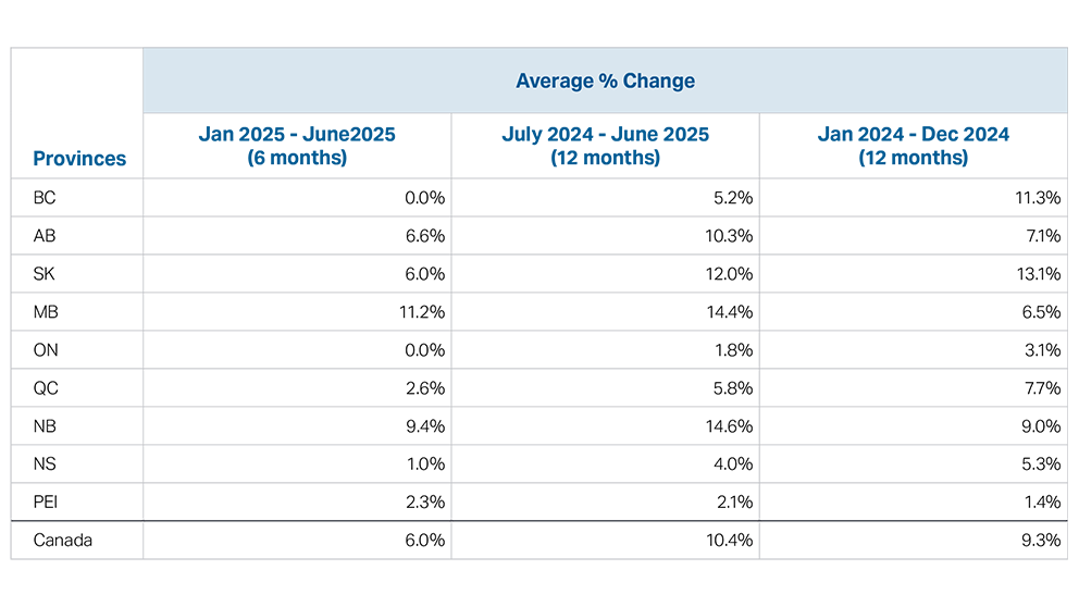 Average farmland values change in the first half of 2025 by province