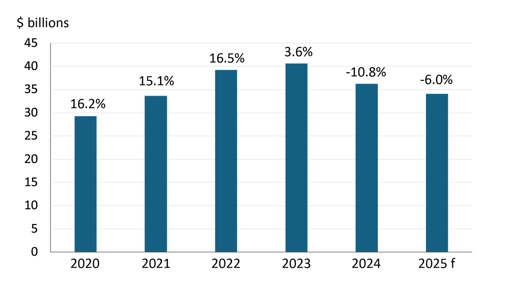 Gervais noted that farm cash receipts fell 1.6 per cent in 2024, mainly due to a drop in grain and oilseed revenue, while livestock receipts rose. In early 2025, grain and oilseed receipts increased slightly, though results vary by crop and region. Looking forward, receipts for grains and oilseeds are expected to decline overall in 2025 by 6.0 per cent. Easing interest rates and healthy farm balance sheets should provide underlying support to farmland values. Yet the farm economy may reflect a more cautious environment in the second half of 2025 and 2026 when it comes to the demand for farmland.
