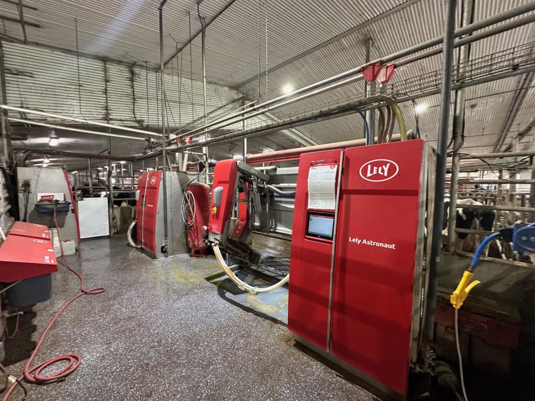 | Barn: | 234 stalls with drive through feed alley. 5 A5 Lely robots, large straw pack area, tunnel ventilation with pasture mats for the stalls. Attached to the milkhouse with 5,000 gallon milk tank. |
