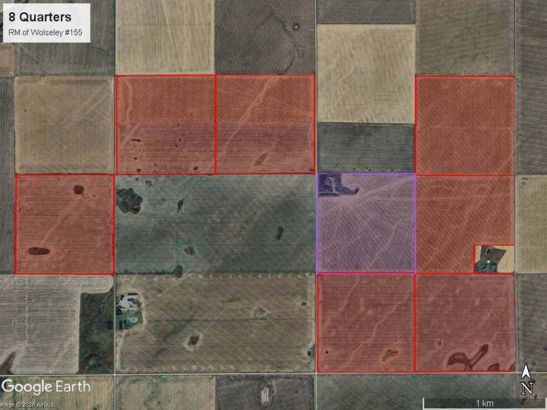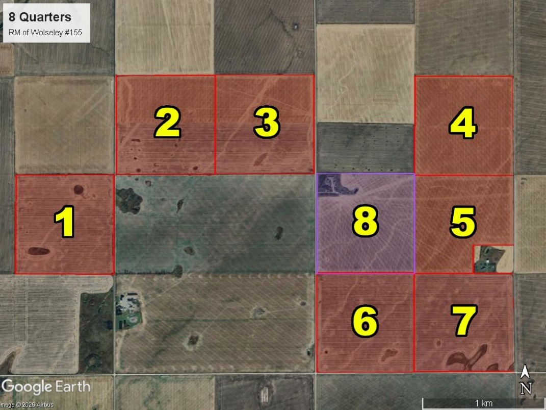 An exceptional parcel of eight quarter sections of highly productive farmland that is wide open (no power lines, no fences, no tree rows) with a slight amount of natural slope providing excellent drainage, including a yard site. This property features Heavy Clay, Clay and Clay Loam soils and is ideally located northwest of Grenfell and only three miles north of Highway #1.