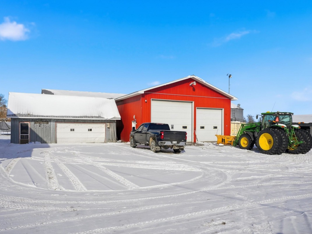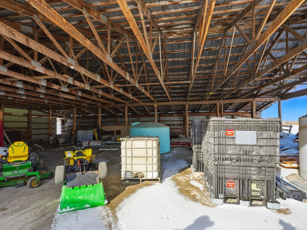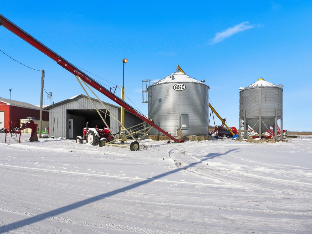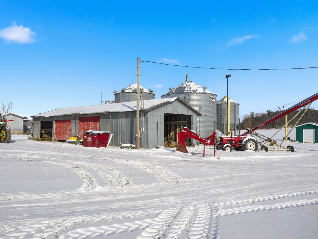 Agricultural infrastructure includes a barn, workshop, garage, multiple storage sheds, and covered buildings designed for efficient farming operations. Four grain bins -- two newer and two older models -- provide substantial storage capacity. The property also features a coverall building for equipment protection.