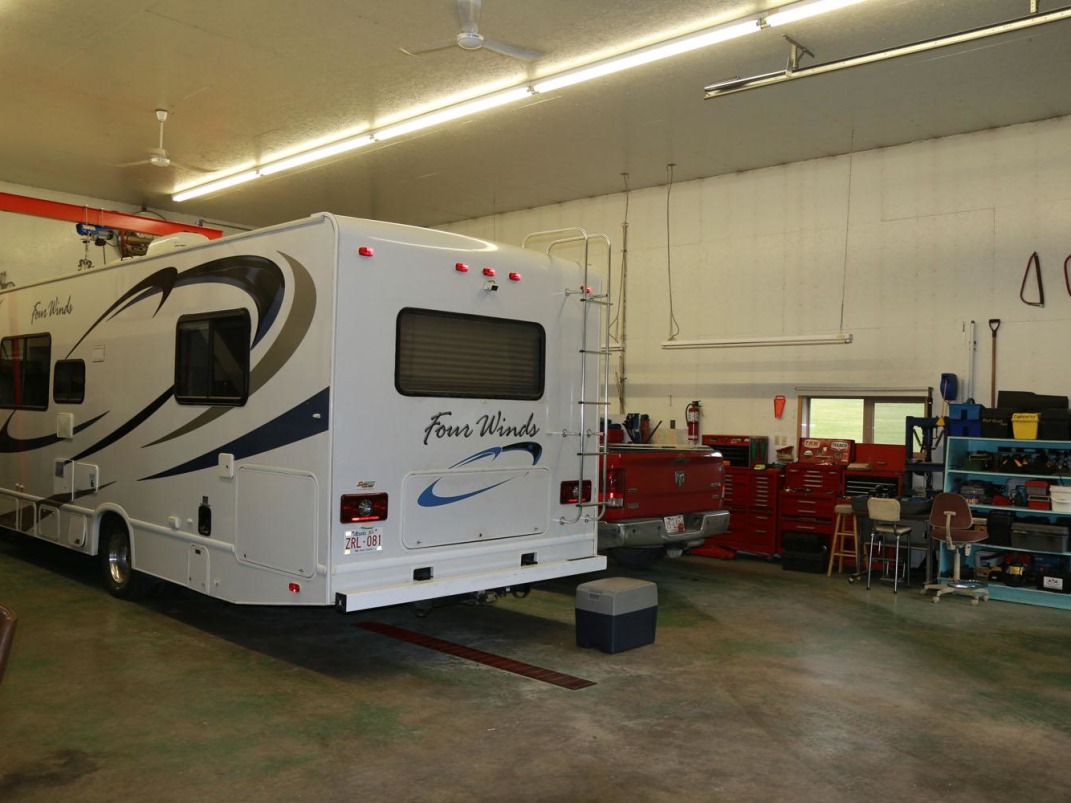 | Workshop: | Size: 40' X 100' in 2 parts Age: 1983 Heating: Natural gas boiler, in-floor main bay Lighting: LED Work areas: The shop is separated into 2 parts: The first part is with a concrete floor and work area, the second part is for machine storage Mezzanine: Storage and office space Floor: Concrete in the first part and gravel base with rubber mat lay down in the second part Exterior: Metal Roof: Metal Plumbing: 3 pc bathroom |